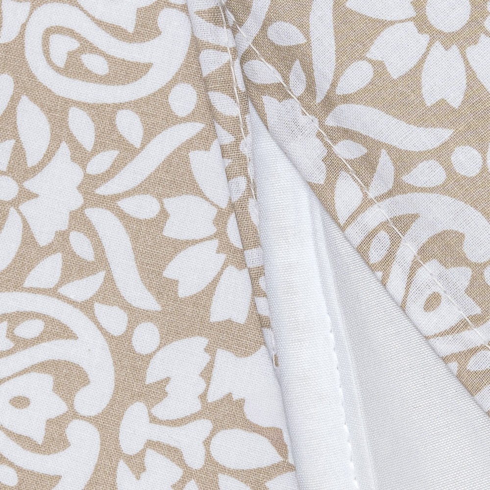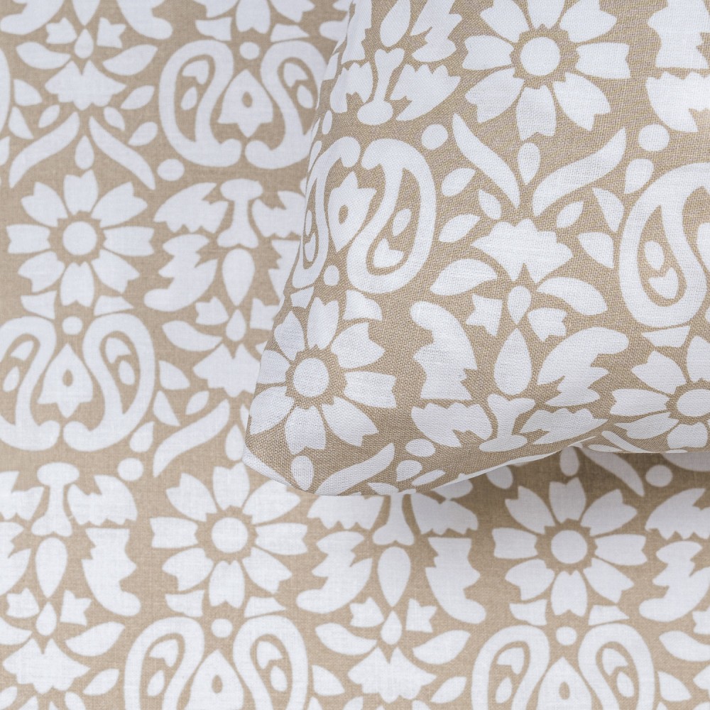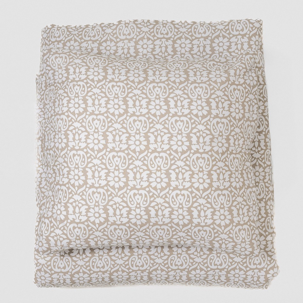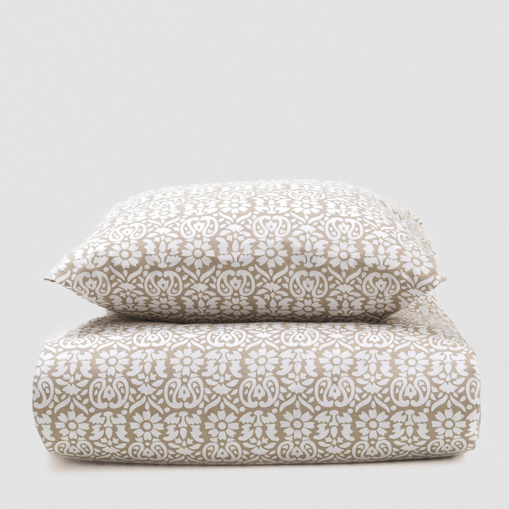 Federe e copripiumino in colore sabbia con stampa di fiori bianchi.