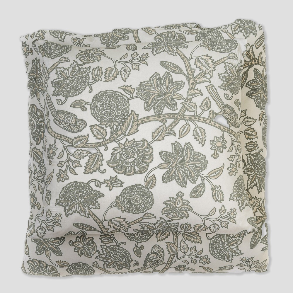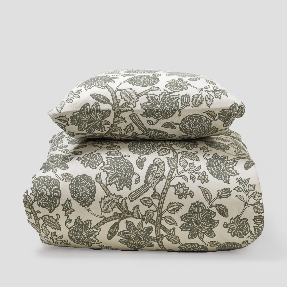 Federe e copripiumino in colore naturale con stampa di fiori verdi.