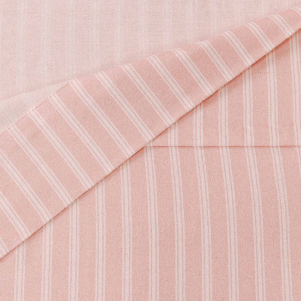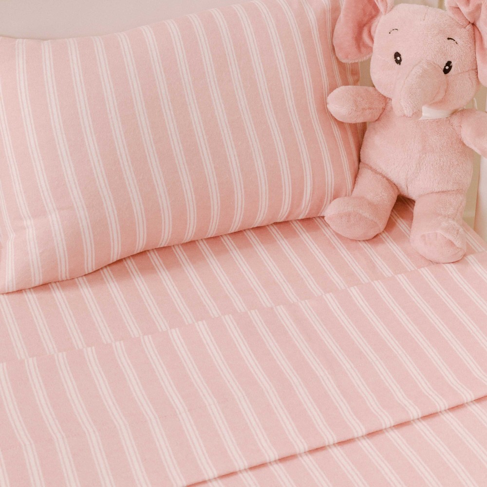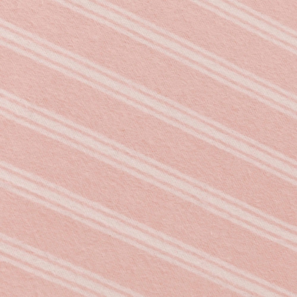 Lenzuola e federa di colore rosa con stampa a righe bianche in morbida flanella, ideali per linverno grazie alle loro caratteristiche termiche.