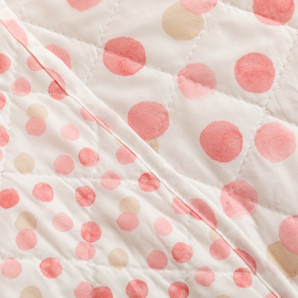 La parte frontale presenta una fantasia giovanile di puntini nei toni del rosa e del sabbia su uno sfondo bianco; il lato posteriore presenta lo stesso disegno.