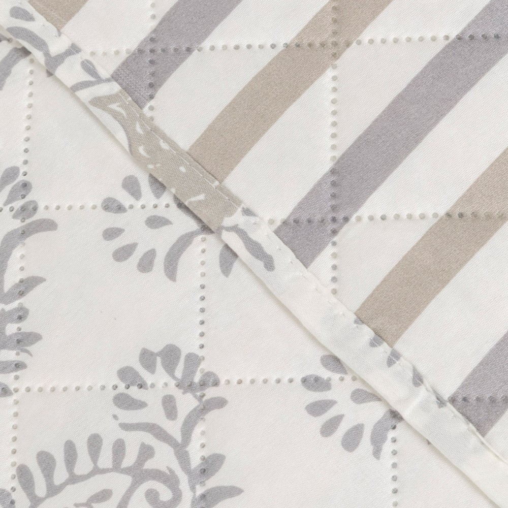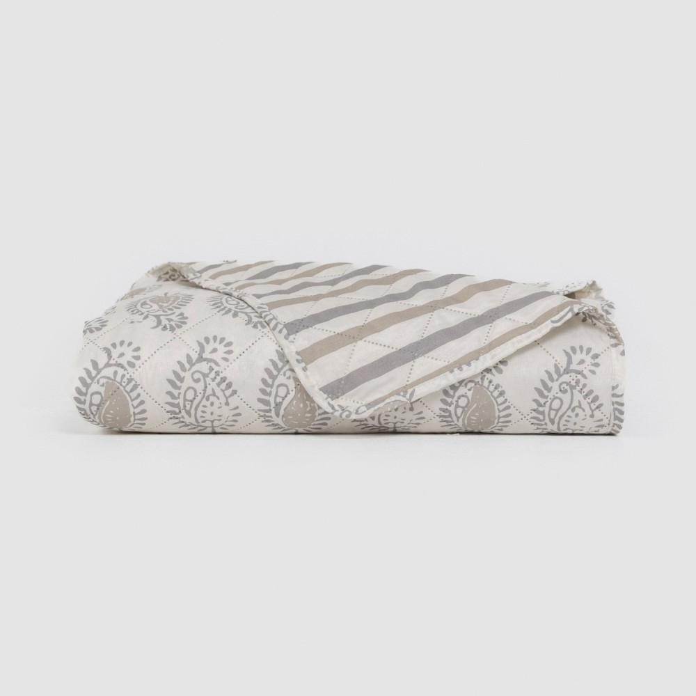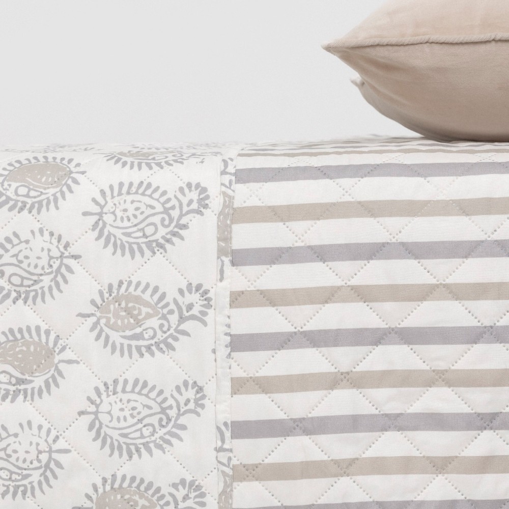 Presenta una stampa discreta a cachemire in toni grigi su sfondo bianco, il retro è bianco con righe grigie e beige.