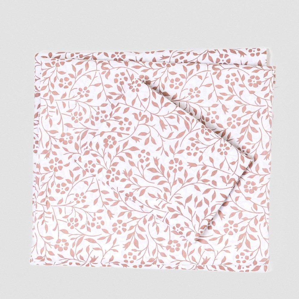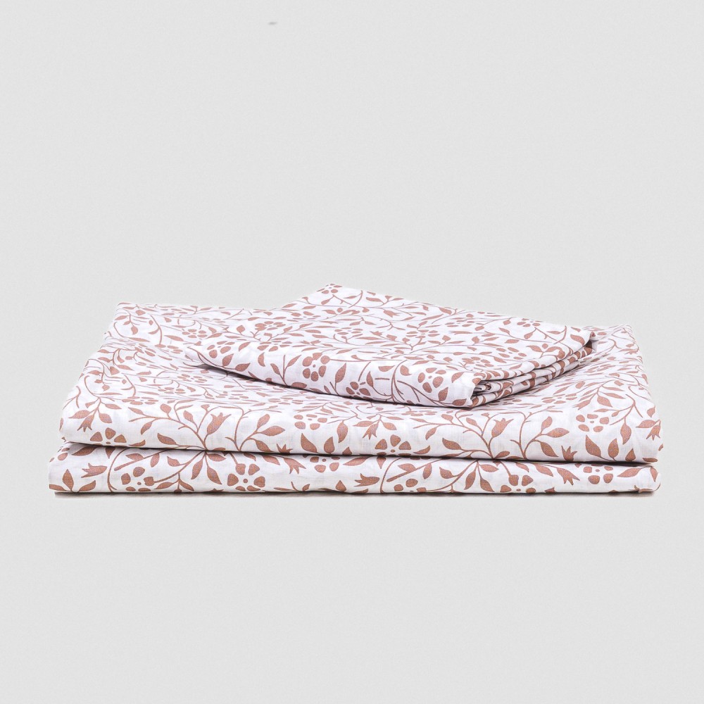 Lenzuola e federe bianche con stampa di fiori rosa.