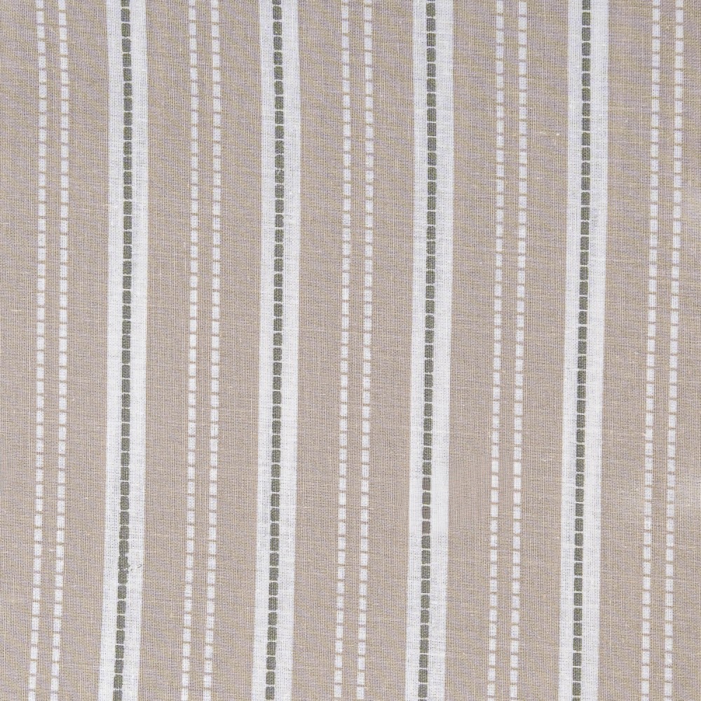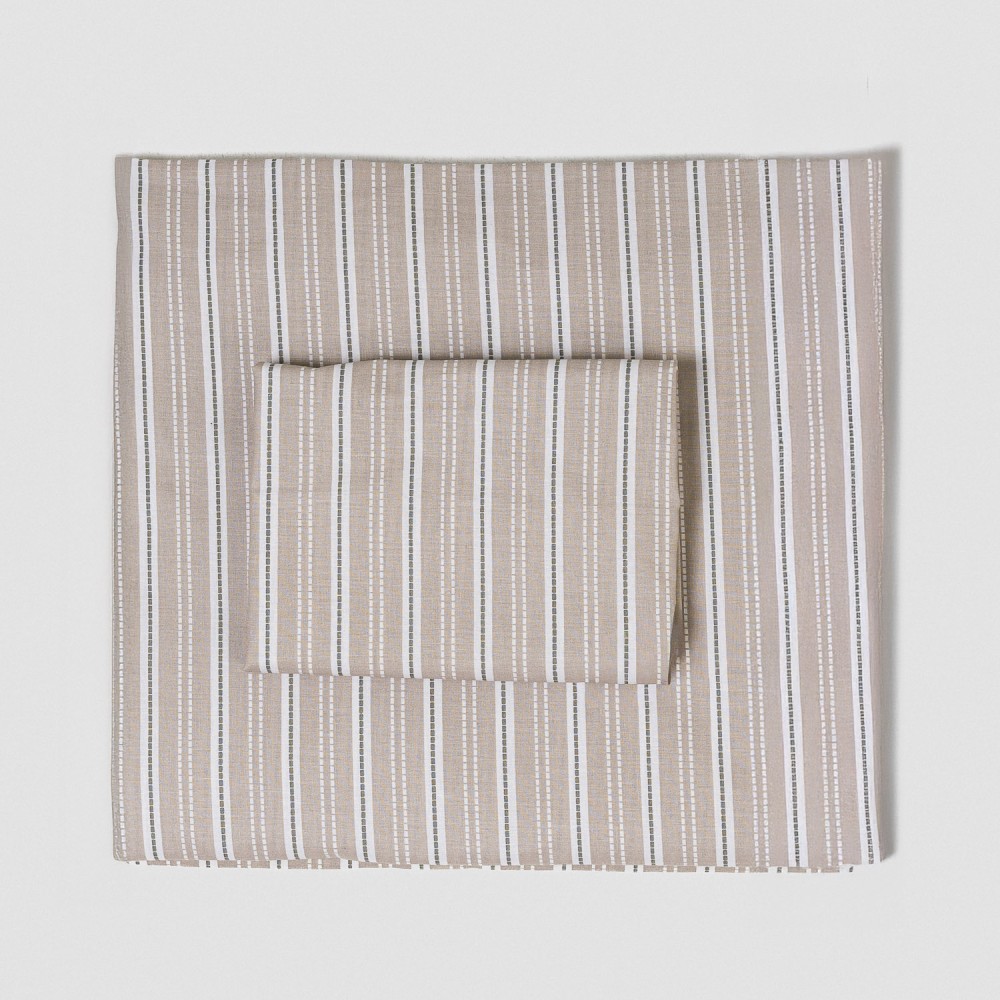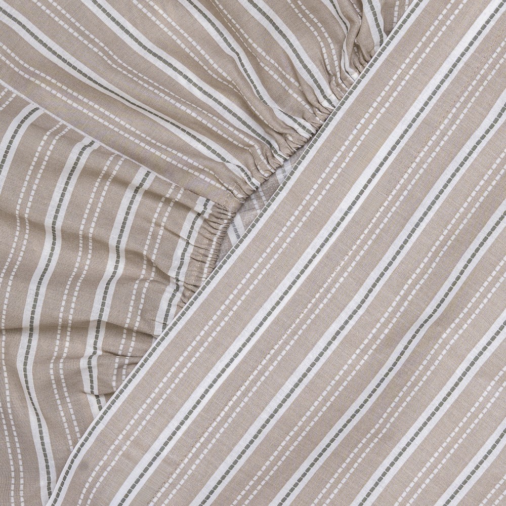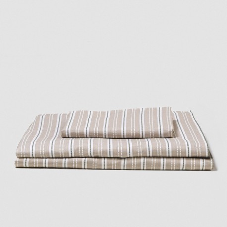 Lenzuola e federe color sabbia con diverse righe bianche e verdi.