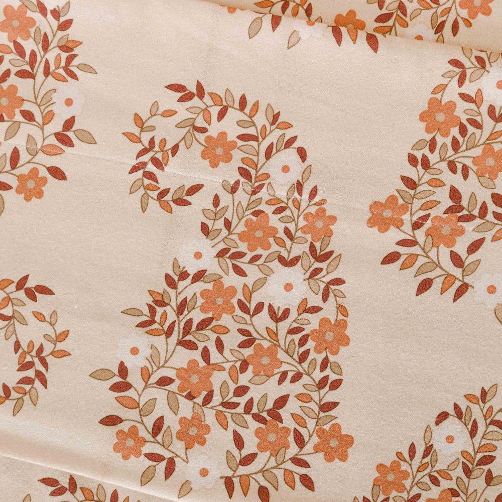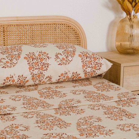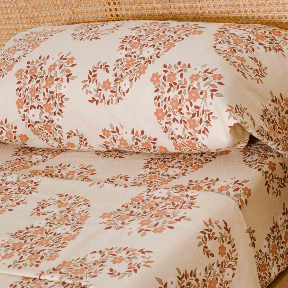 Lenzuola e federe di colore sabbia con stampa cachemire di fiori e foglie in morbida flanella, ideali per linverno grazie alle loro caratteristiche termiche.