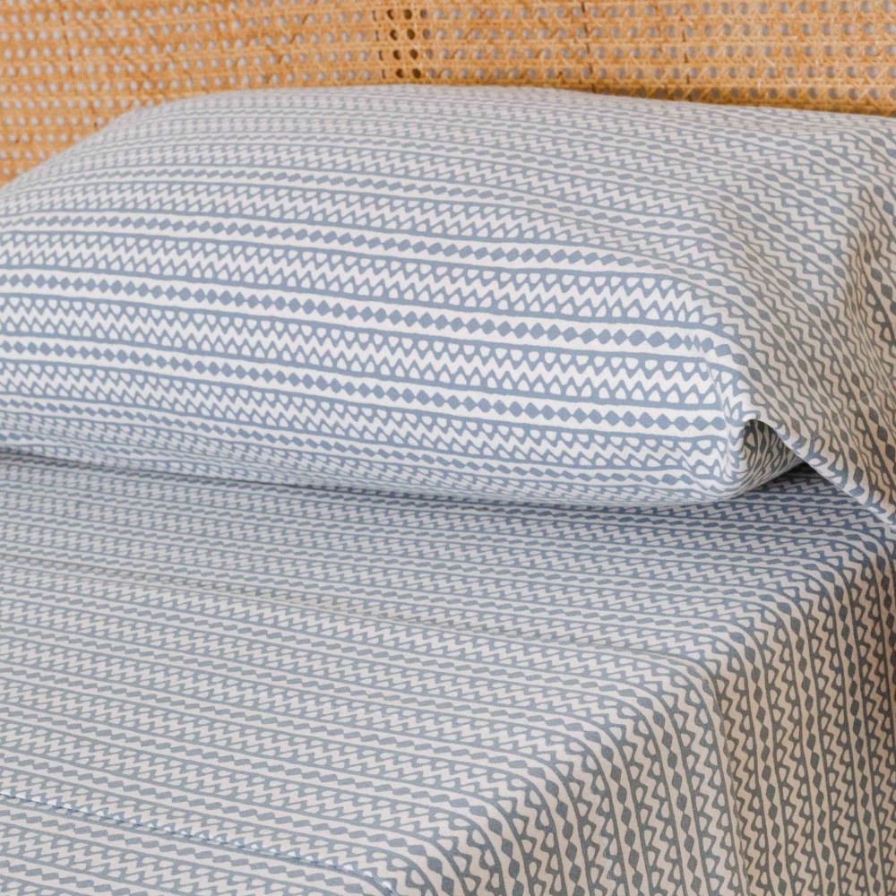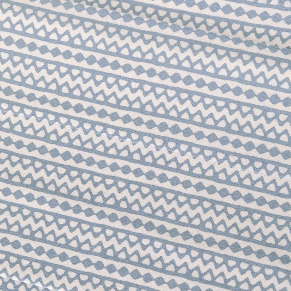 Lenzuola e federe di colore bianco con stampa etnica di colore blu in morbida flanella, ideali per linverno grazie alle loro caratteristiche termiche.
