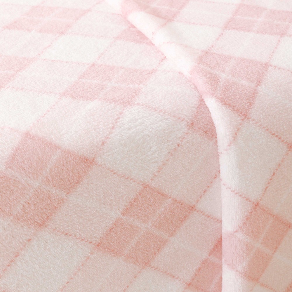 Lenzuola e federa con stampa a quadri rosa su fondo bianco.