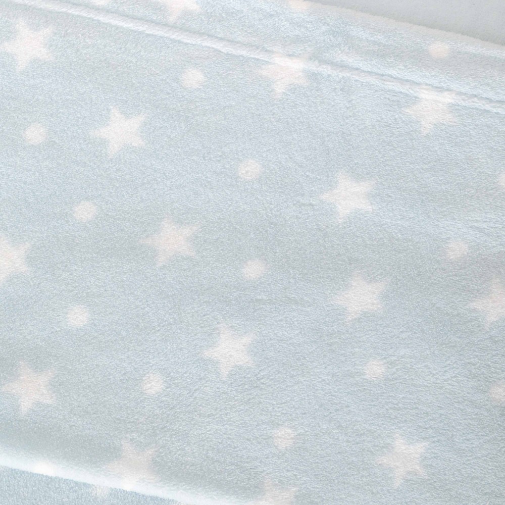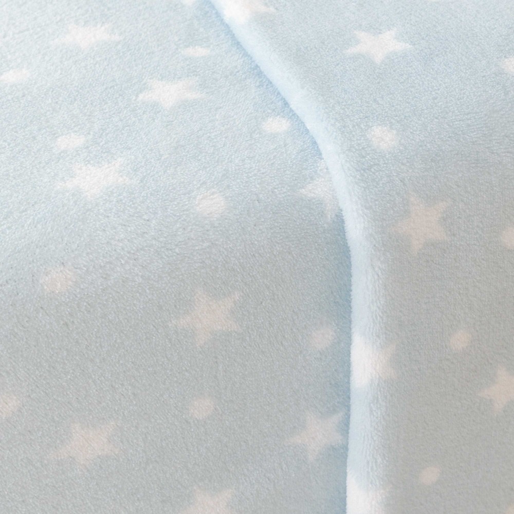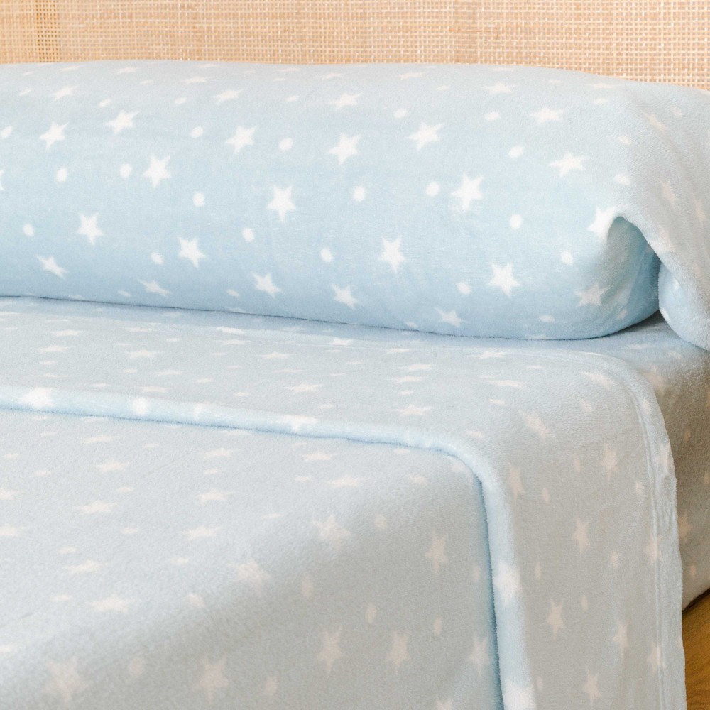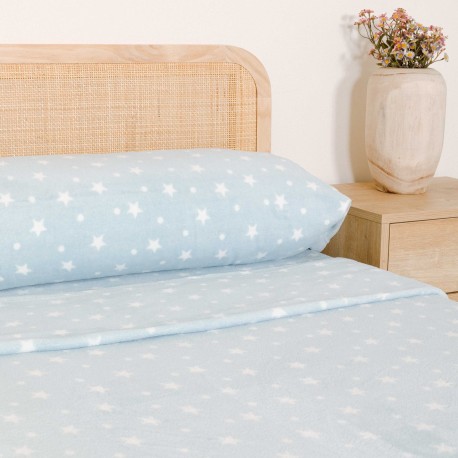 Lenzuola e federa con stampa di piccole stelle e pois bianchi su fondo blu.