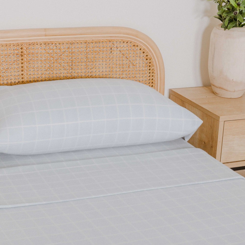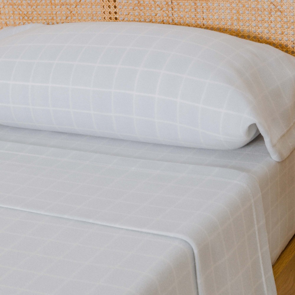 Lenzuola e federe con semplice fantasia a quadri bianchi su sfondo celeste.