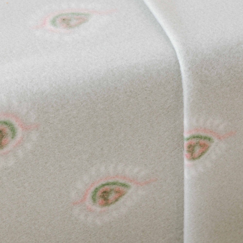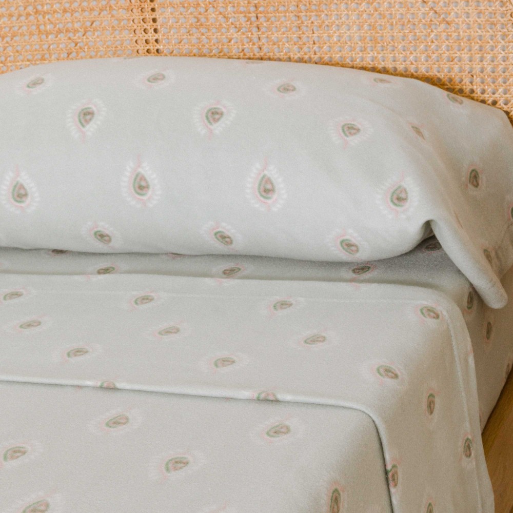 Lenzuola e federe con elegante fantasia di foglie nei toni del bianco, verde e rosa su sfondo verde chiaro.