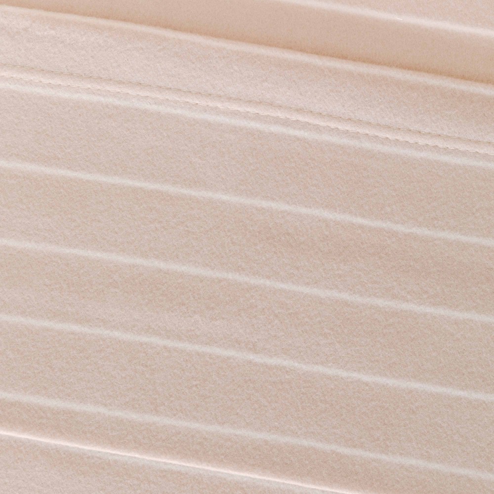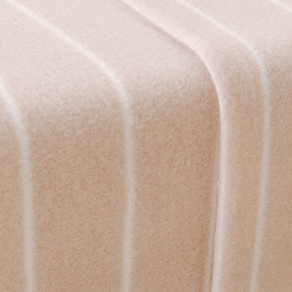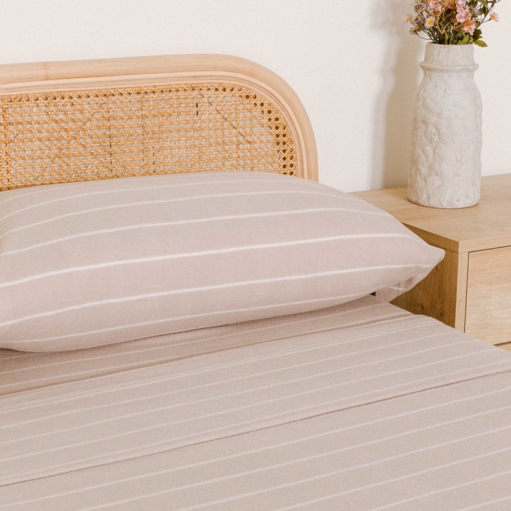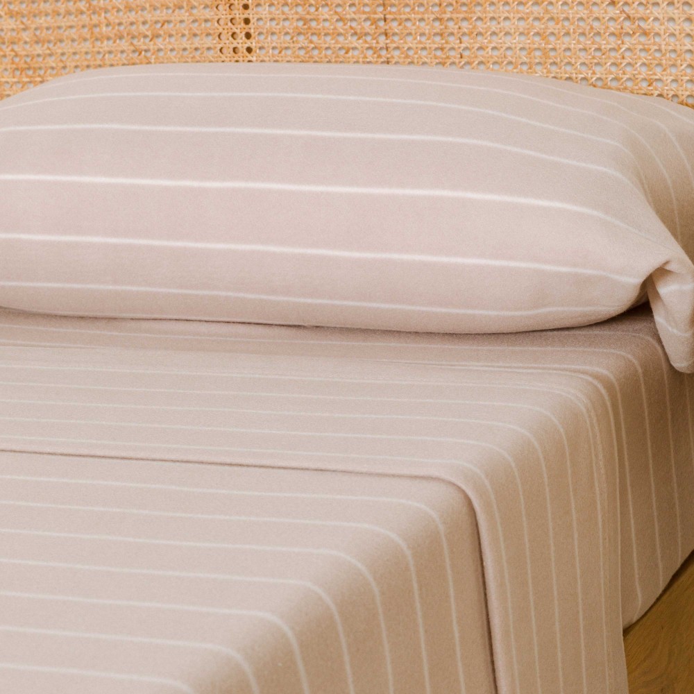 Lenzuola e federe con stampa classica a righe bianche su sfondo sabbia.