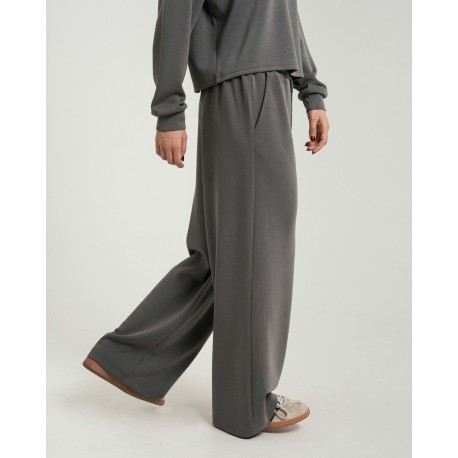 Pantalone a gamba larga e morbida, con tasche laterali e vita elastica con cordoncino.