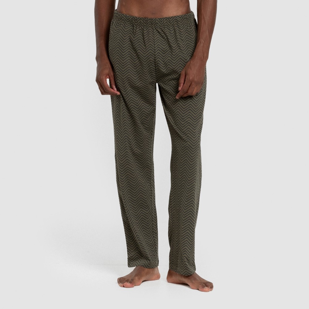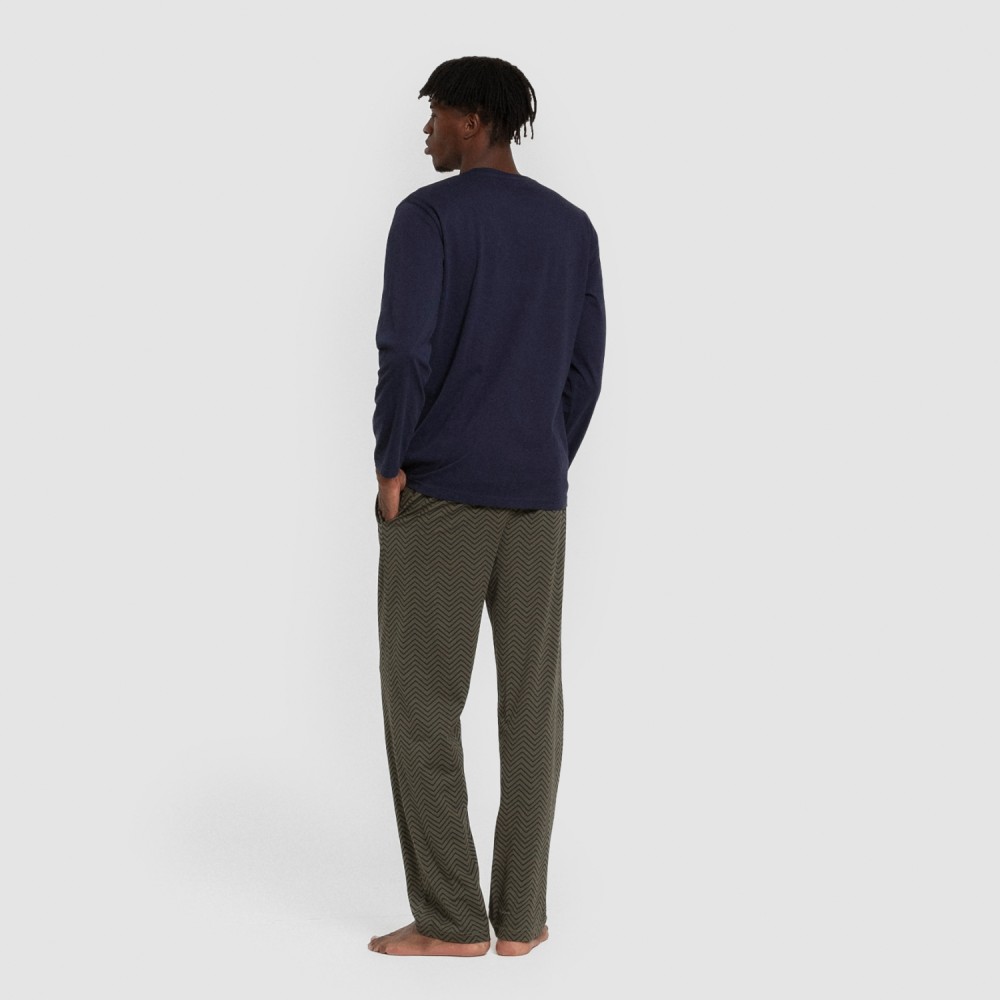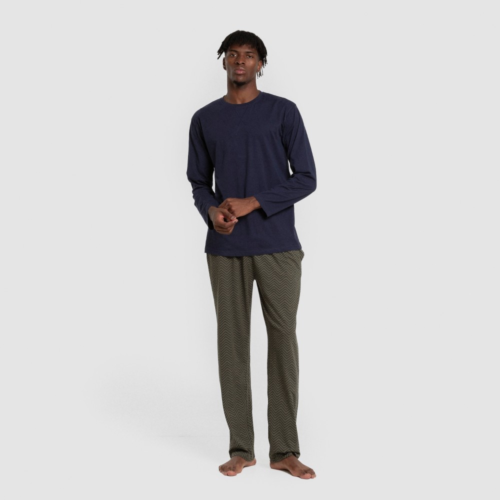 Il pigiama è composto da una semplice maglietta blu navy e pantaloni con una stampa a zigzag su uno sfondo verde. I pantaloni del pigiama hanno un elastico in vita per adattarsi perfettamente al corpo.