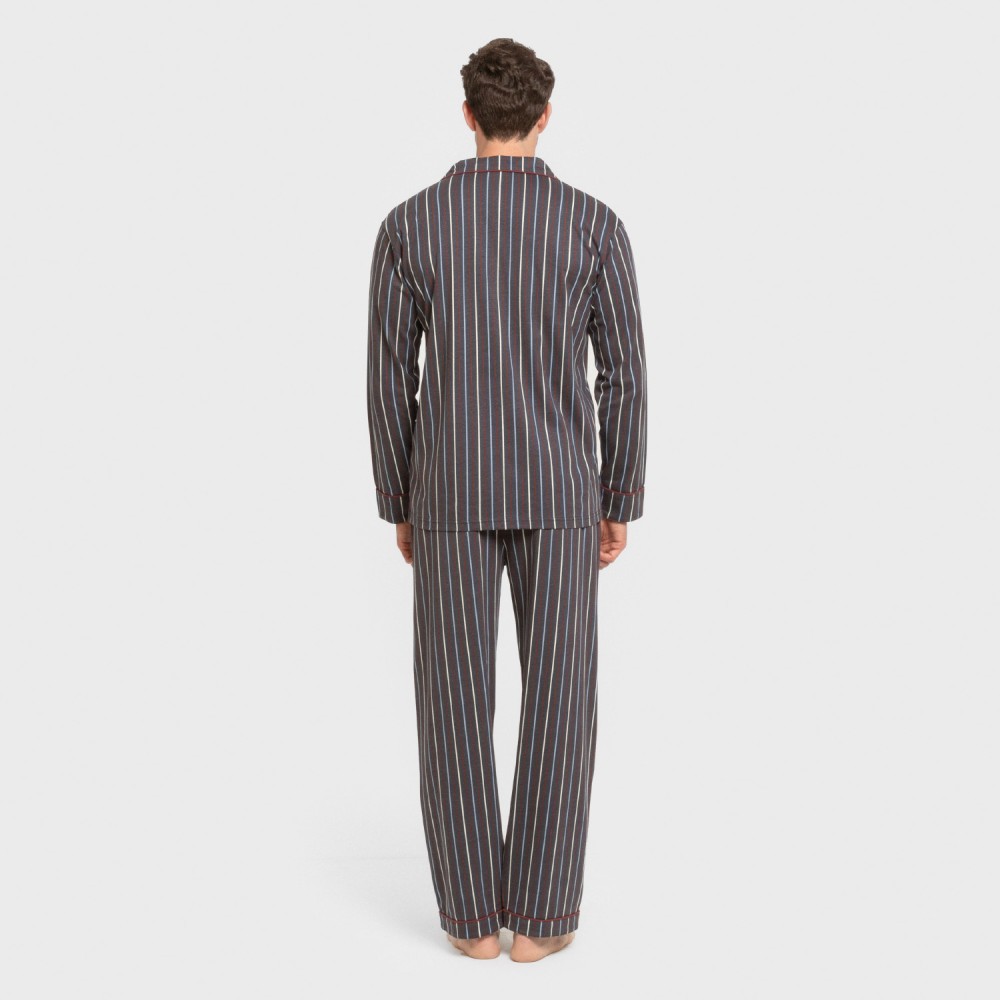 Pigiama aperto in cotone con una semplice stampa a righe bianche, blu e rosse su sfondo blu navy. Include una maglietta con colletto abbottonato e pantaloni con elastico in vita.
