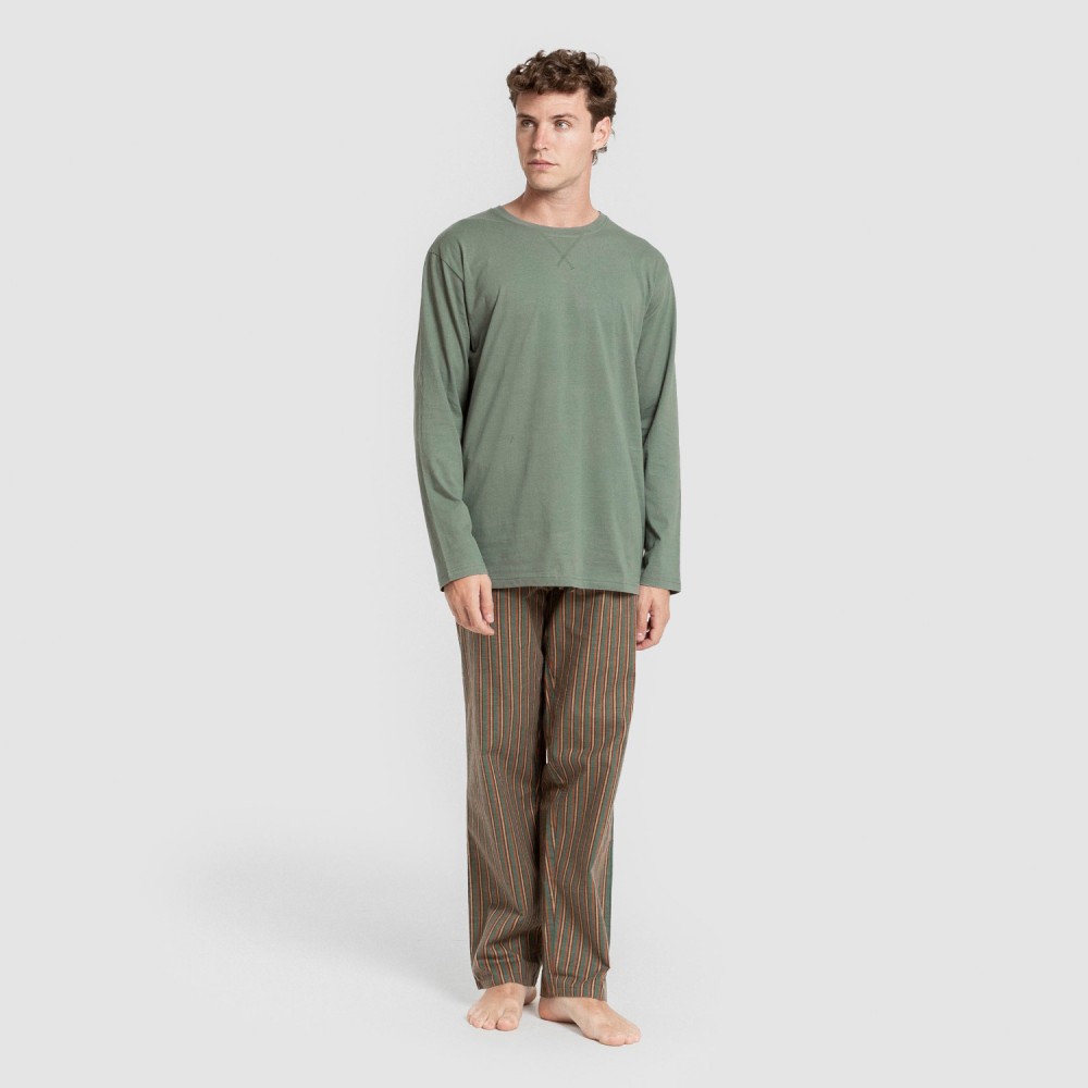 Maglia liscia di colore verde e pantaloni dello stesso tono con righe marroni. I pantaloni del pigiama hanno la cintura elastica rivestita con un nastro regolabile.