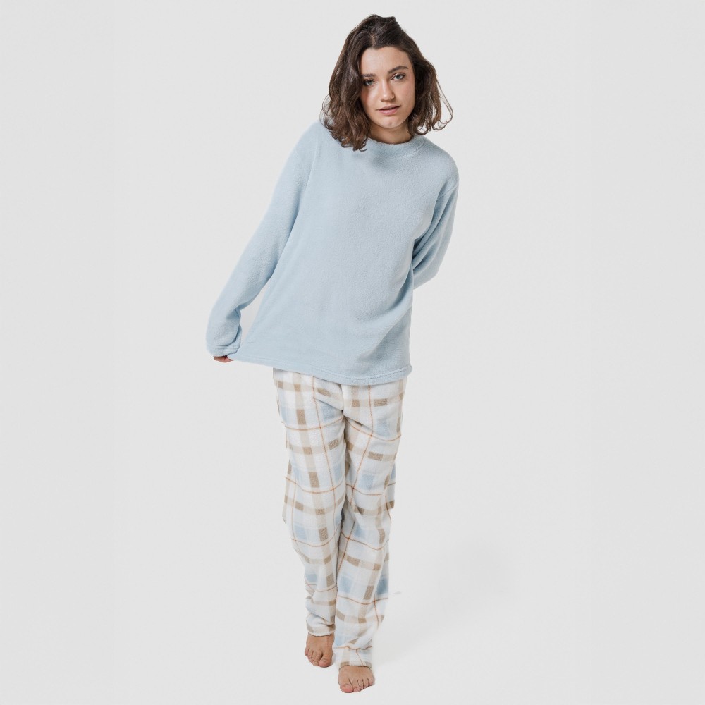 Il pigiama include una maglietta liscia di colore blu e un pantalone bianco a quadri marroni e blu.