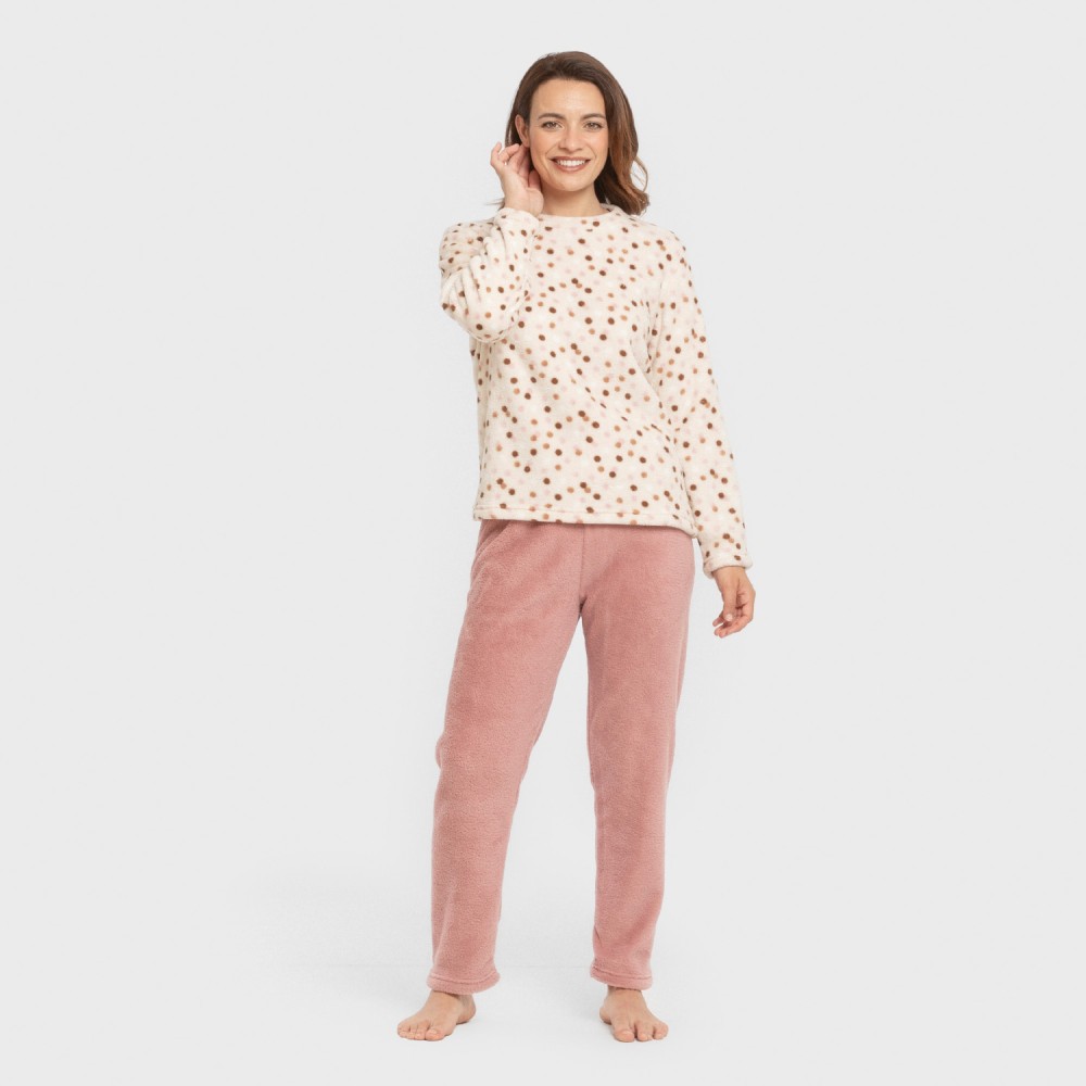 Il pigiama include una maglietta bianca con stampa a pois marroni e rosa e un pantalone liscio di colore malva.