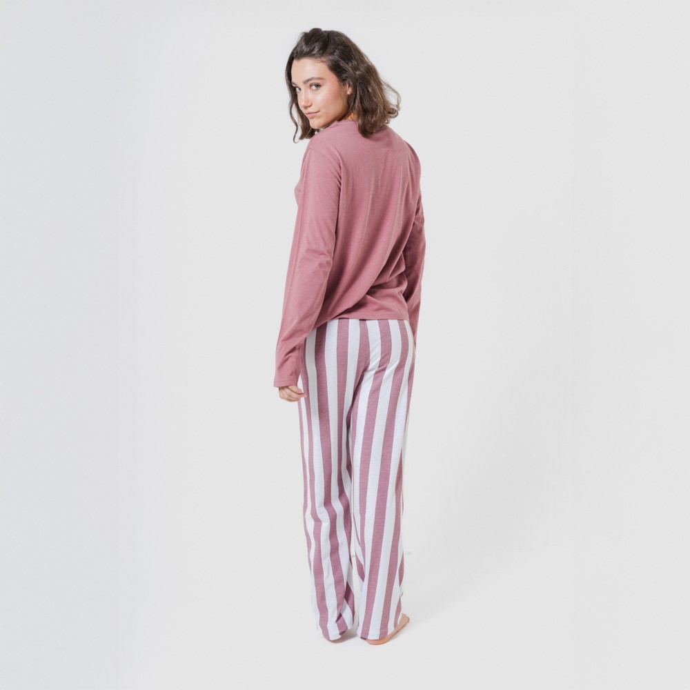 Il pigiama è composto da una maglia a maniche lunghe color malva, a tinta unita, con tre piccoli bottoni sul collo e pantaloni a righe rosa malva su sfondo bianco. I pantaloni del pigiama hanno un elastico in vita con coulisse.