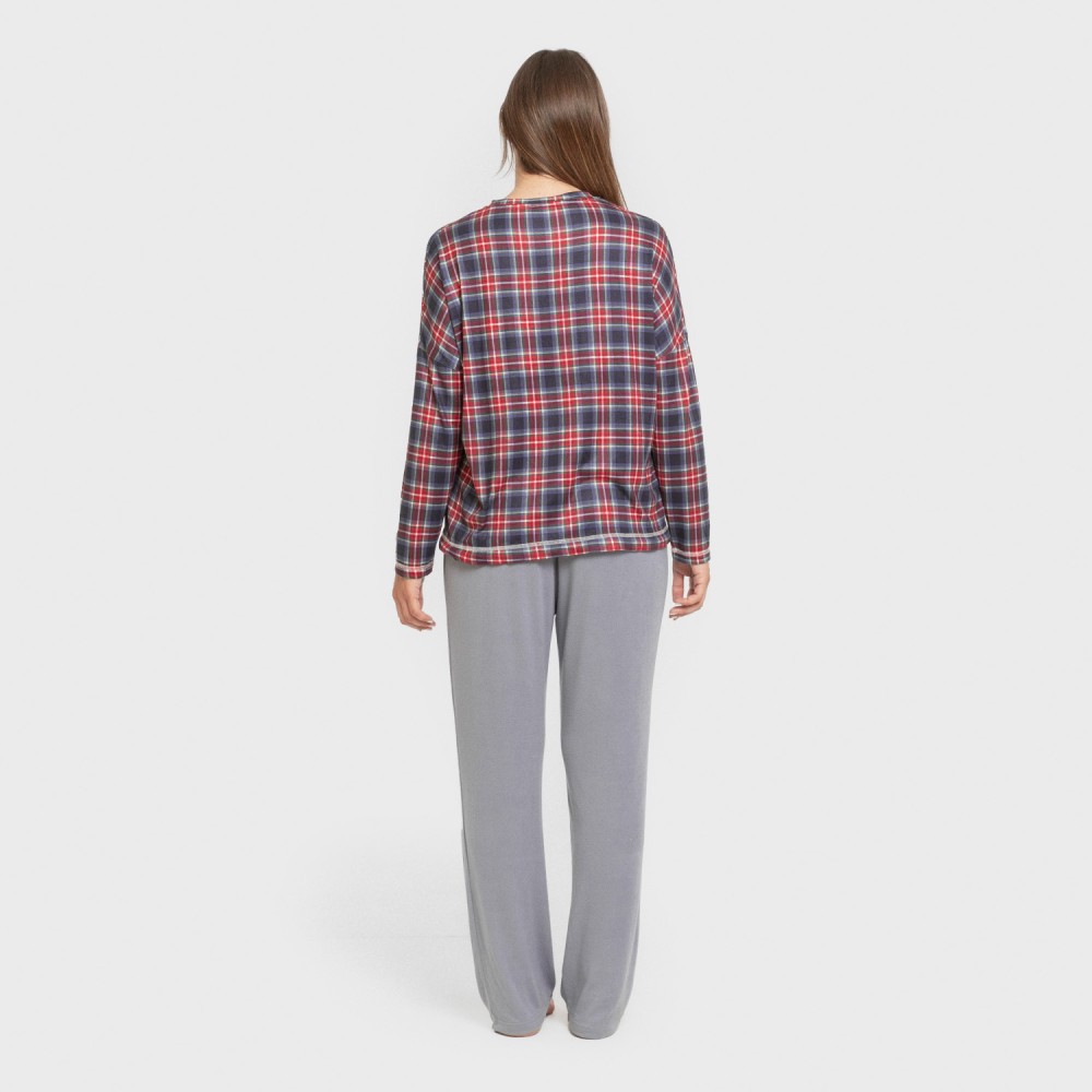 Il pigiama è composto da una maglia a quadri nei toni del rosso e blu, con cordino regolabile sul fondo, e da un pantalone tinta unita color indaco con elastico in vita.