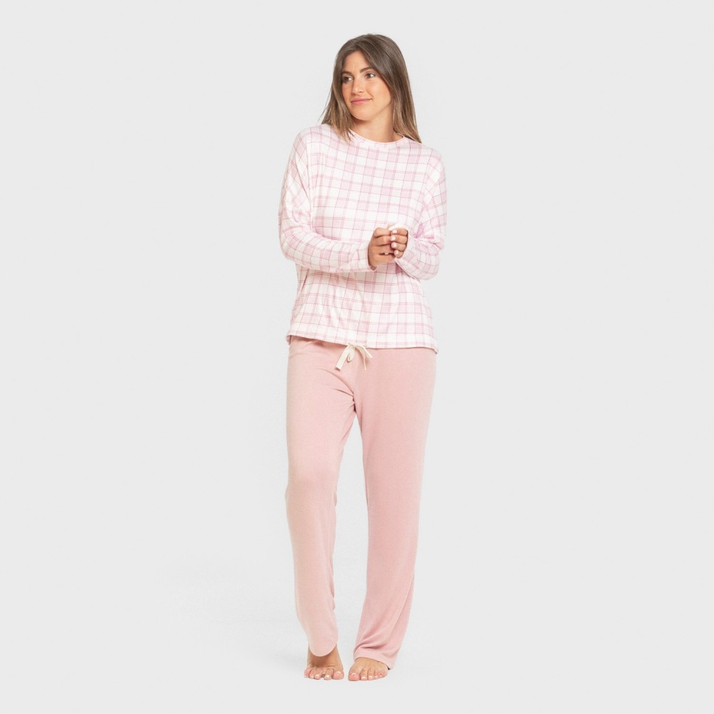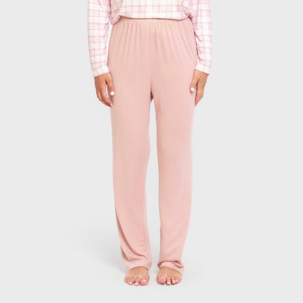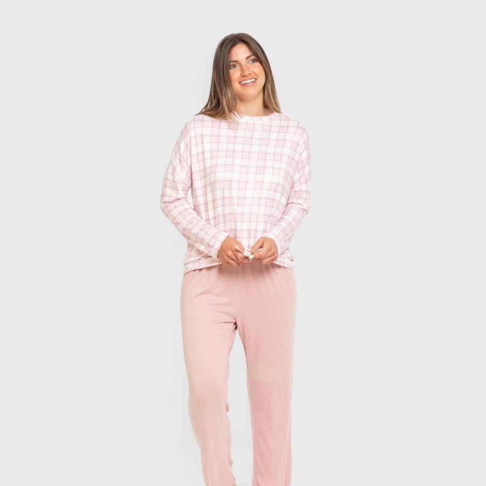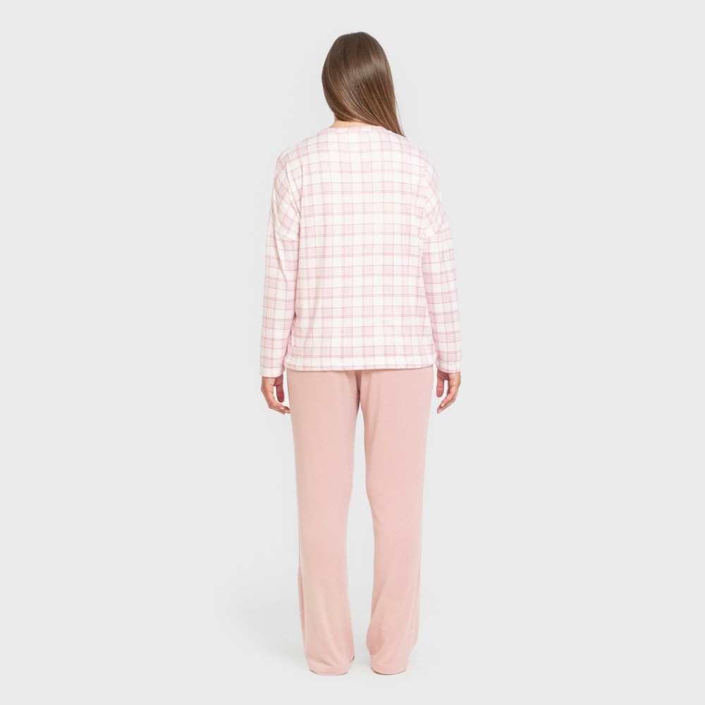 Il pigiama è composto da una maglia a quadri rosa e bianchi, con cordino regolabile sul fondo, e da un pantalone tinta unita rosa con elastico in vita.