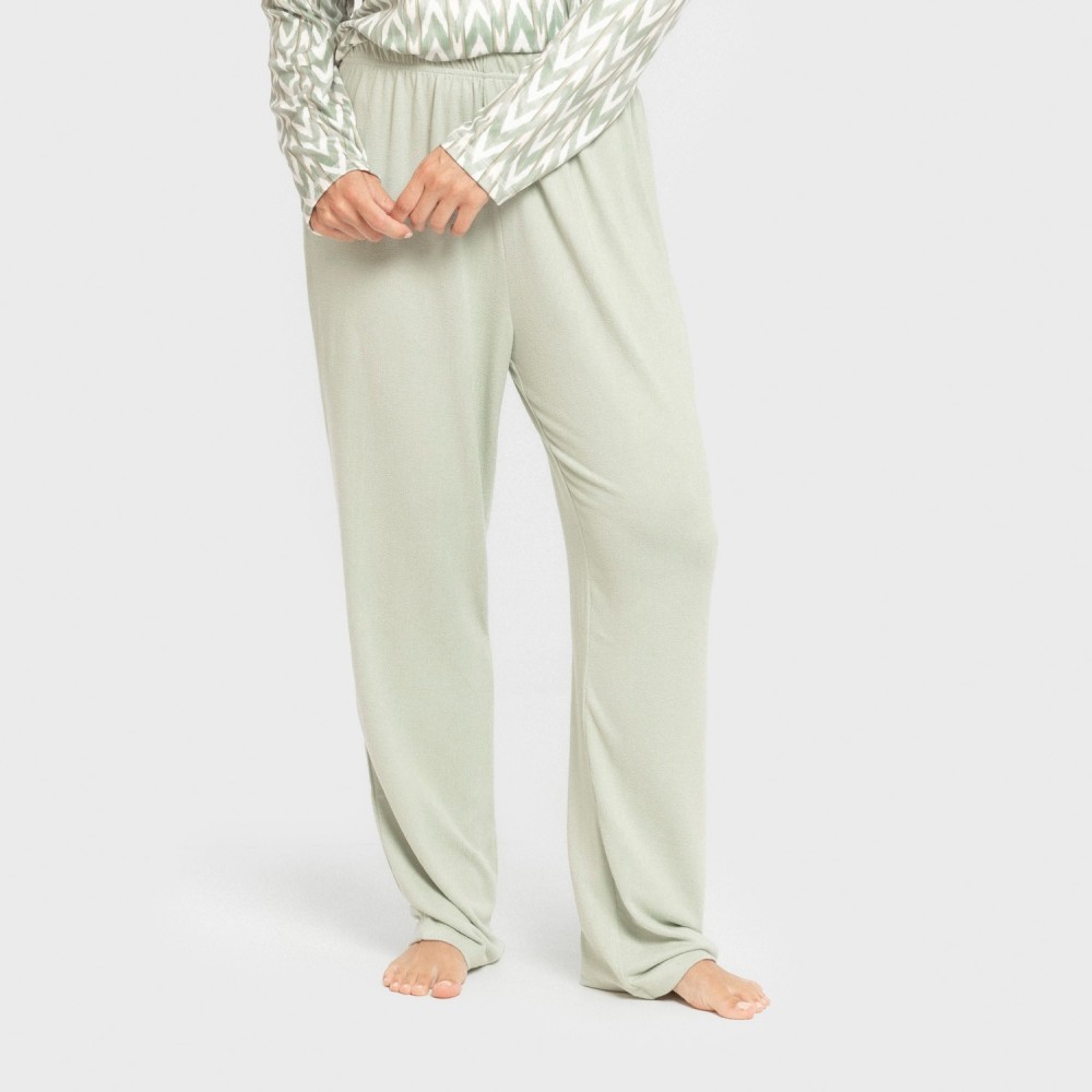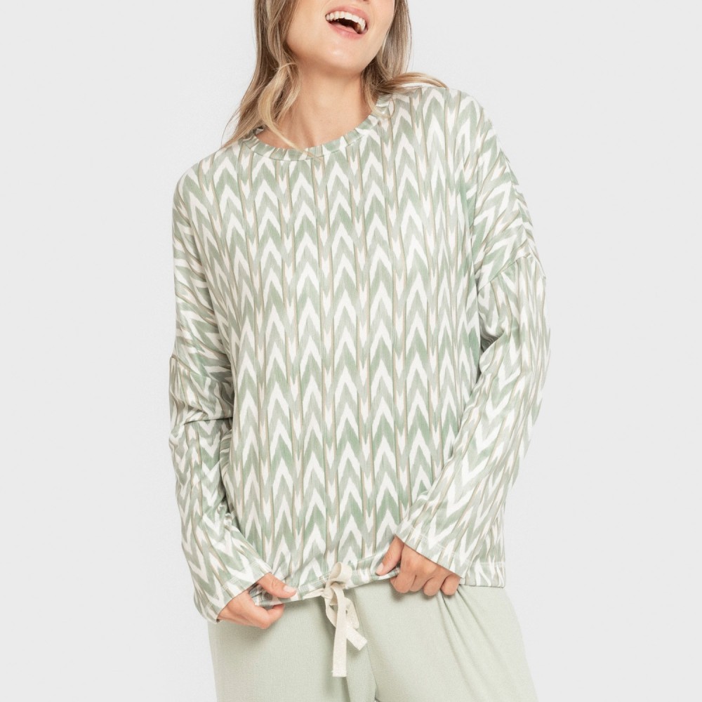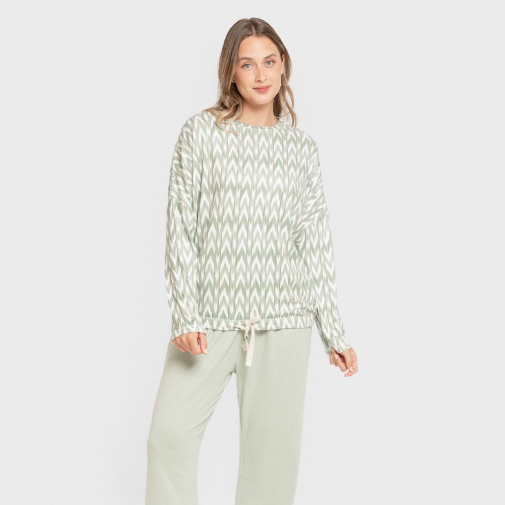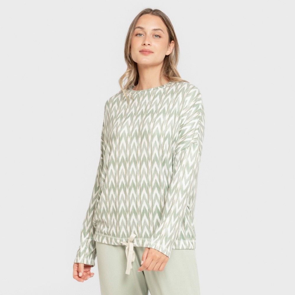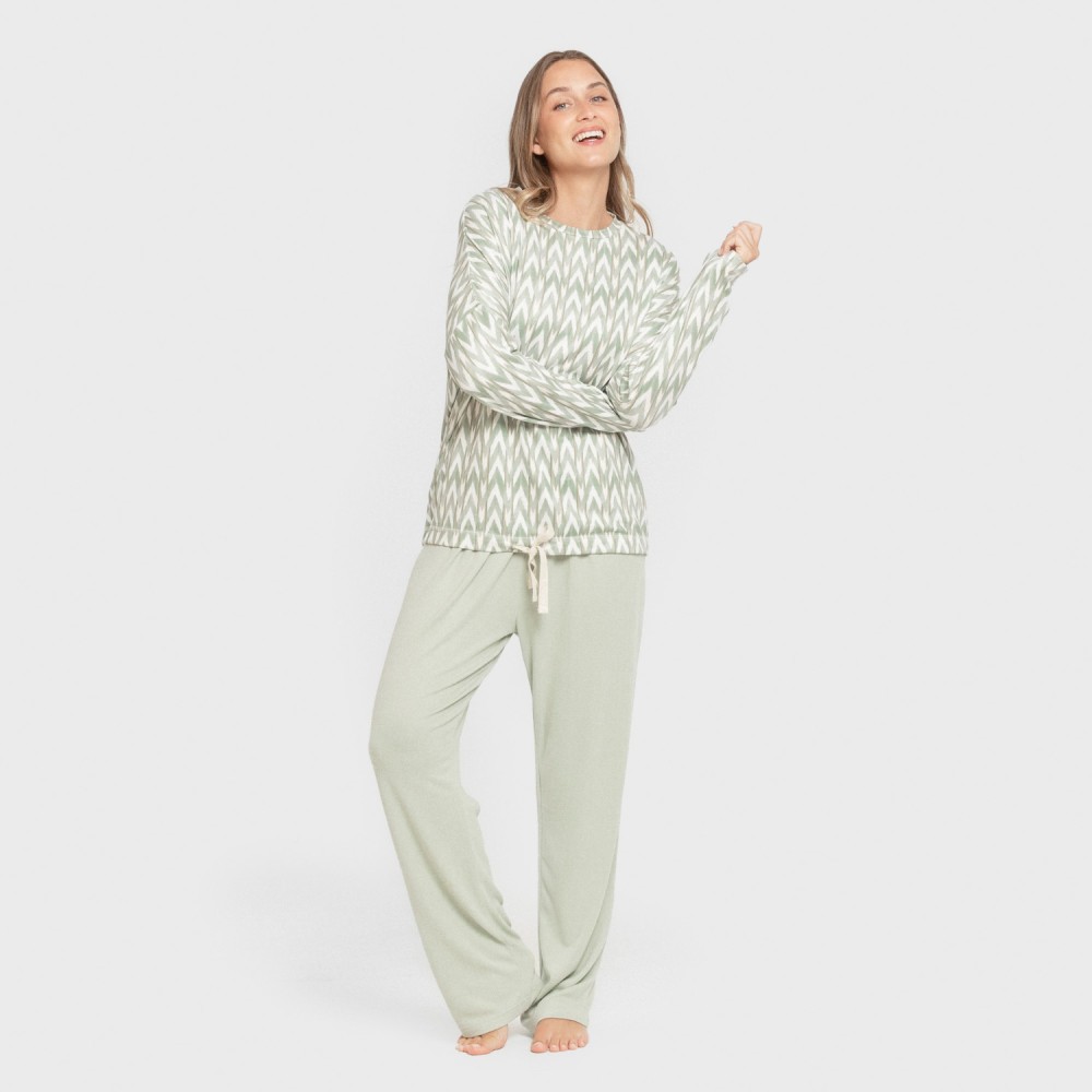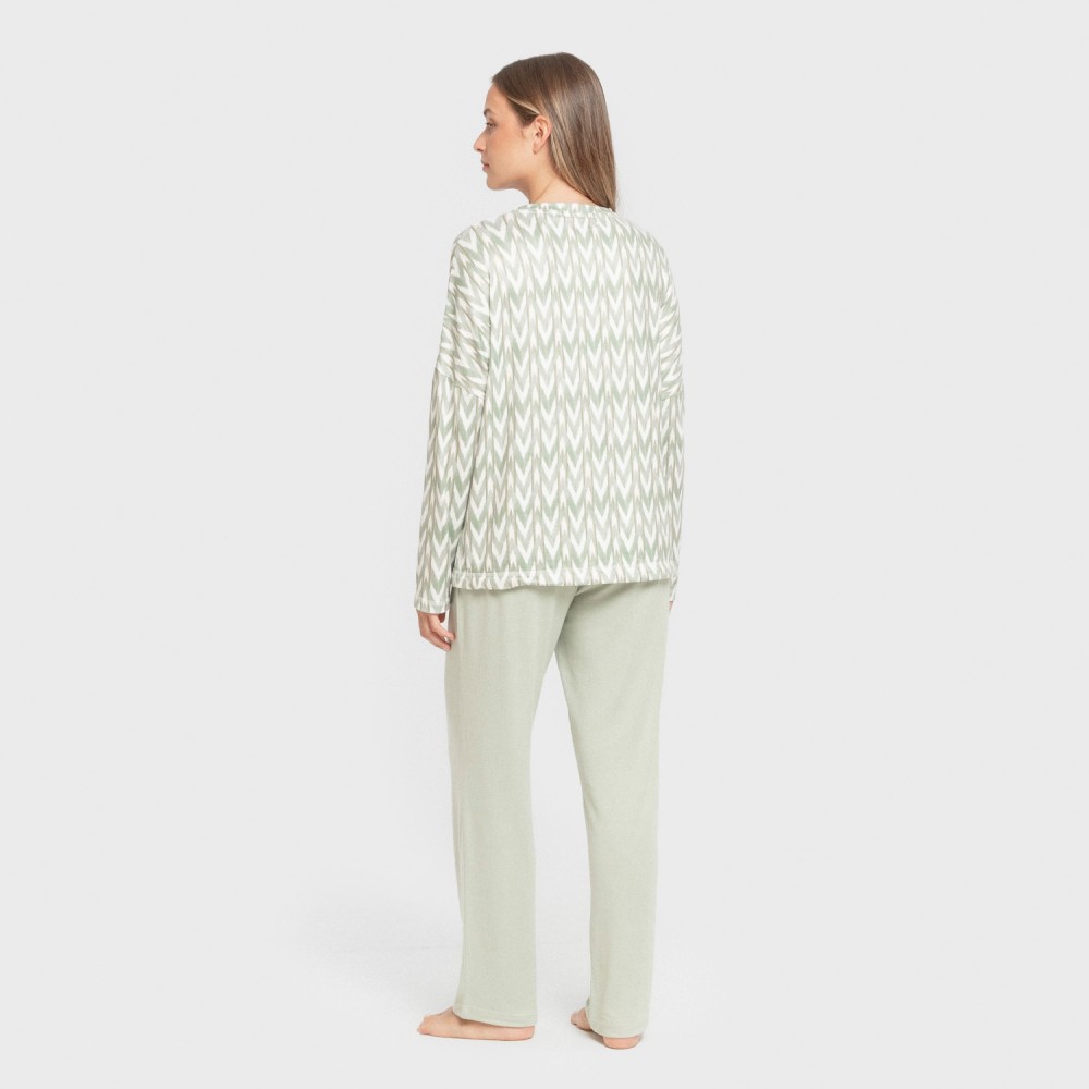 Il pigiama è composto da una maglia stampata con figure geometriche nei toni del verde e marrone, con cordino regolabile sul fondo, e da un pantalone tinta unita verde chiaro con elastico in vita