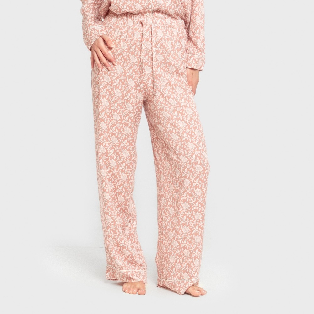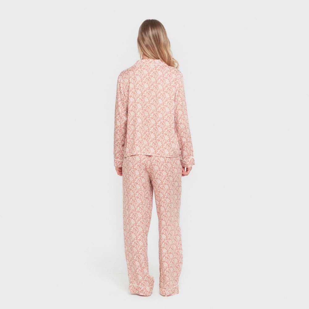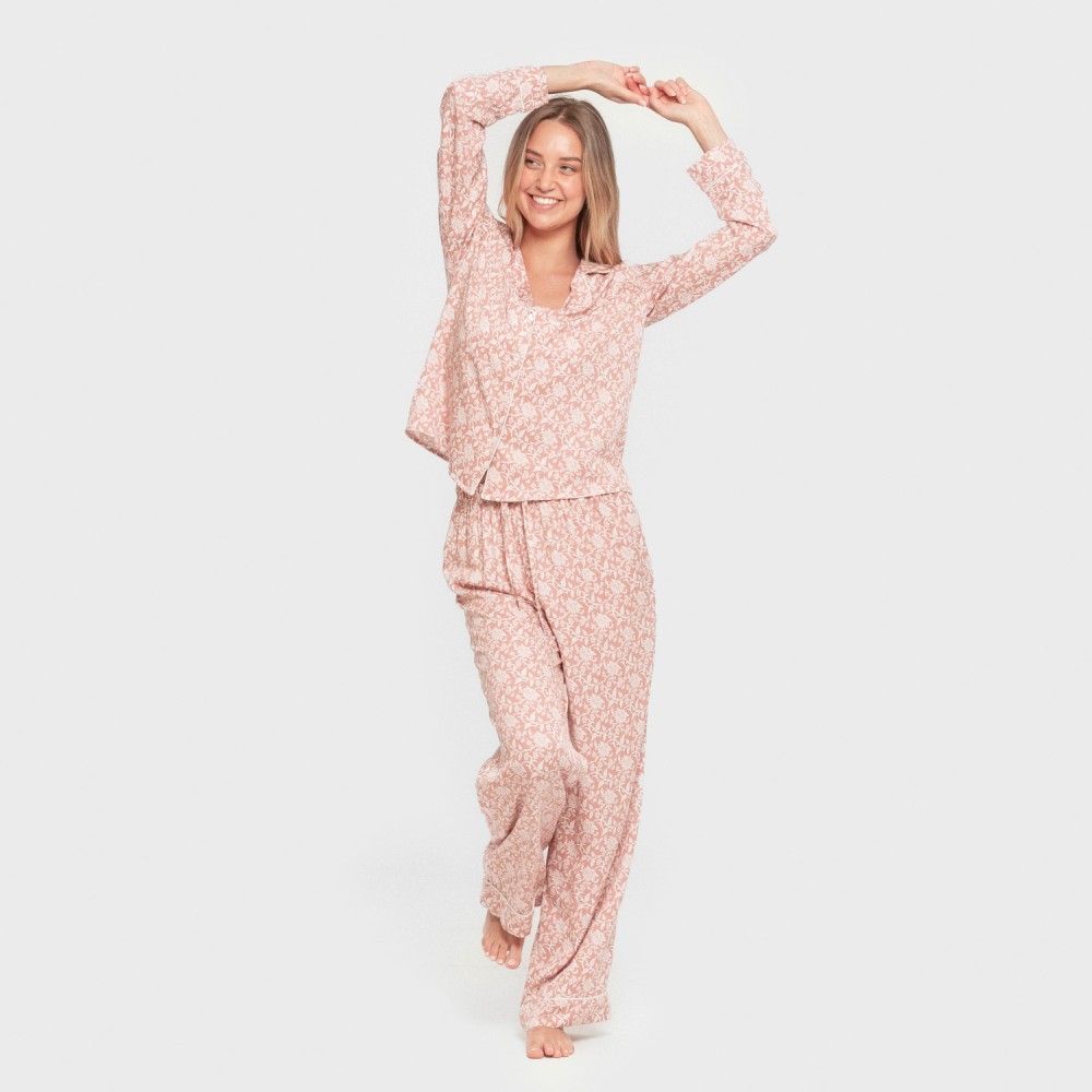 Include una camicia con bottoni e revers e pantaloni lunghi fluidi di colore rosa con stampa di fiori bianchi.