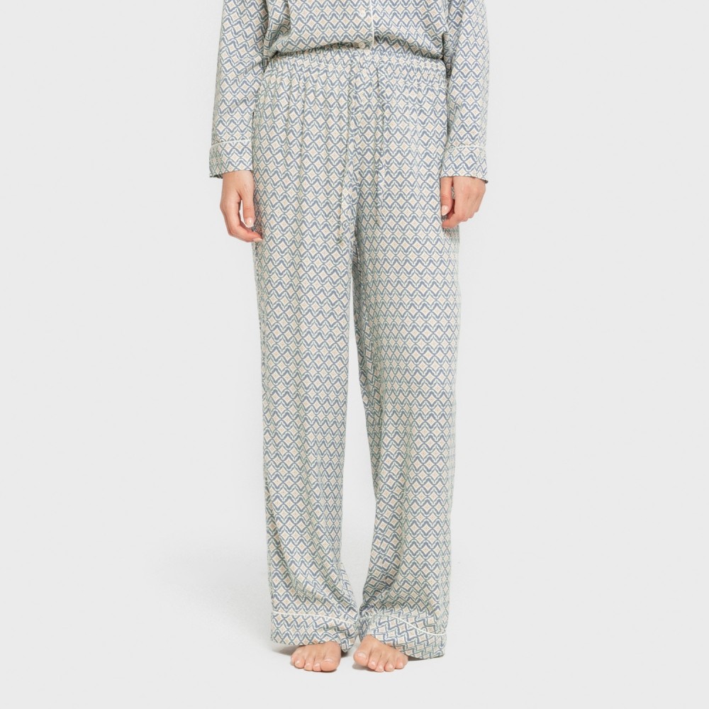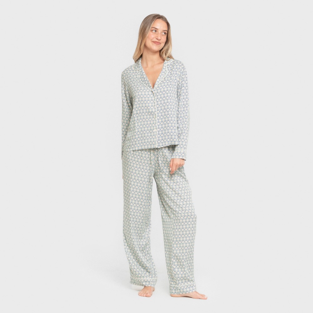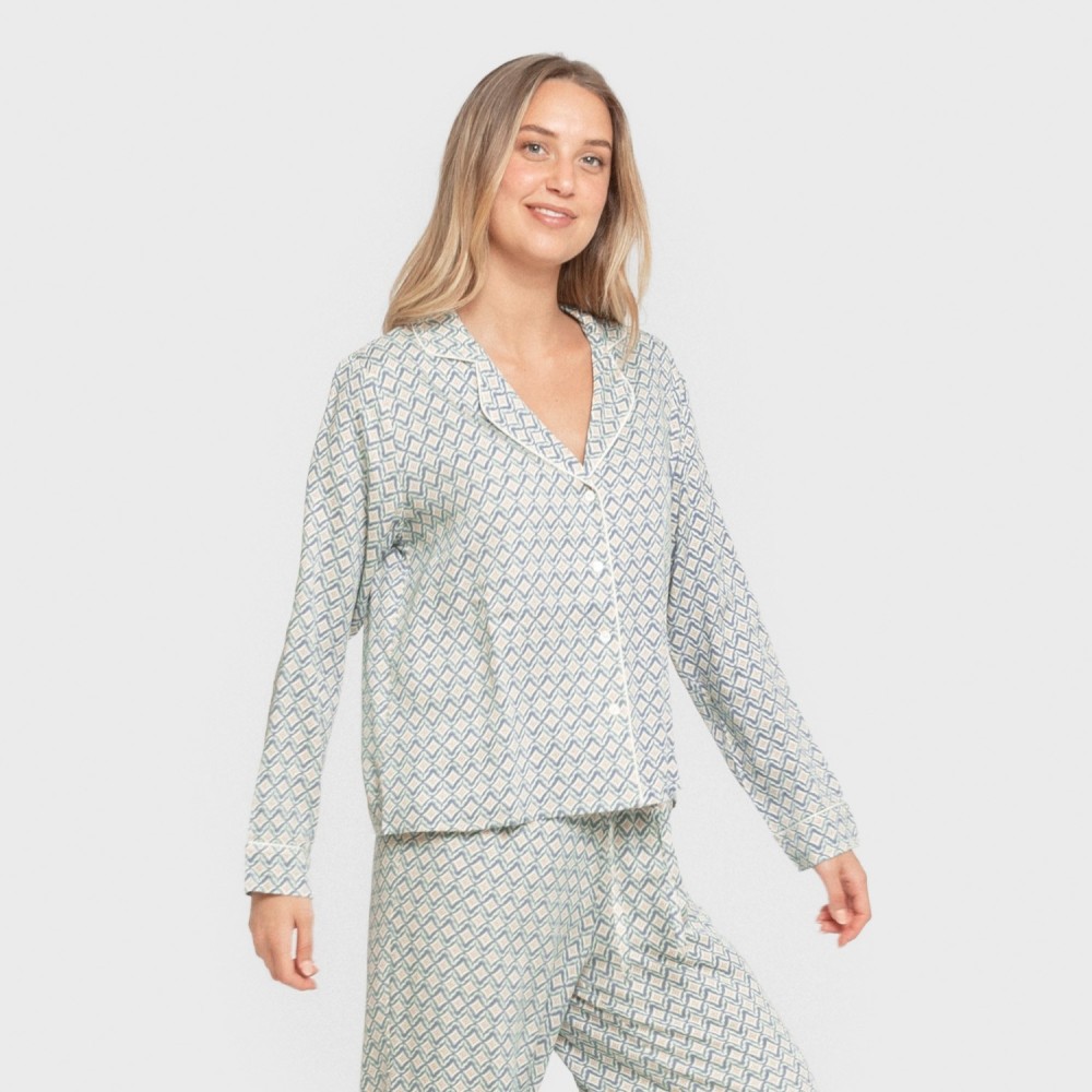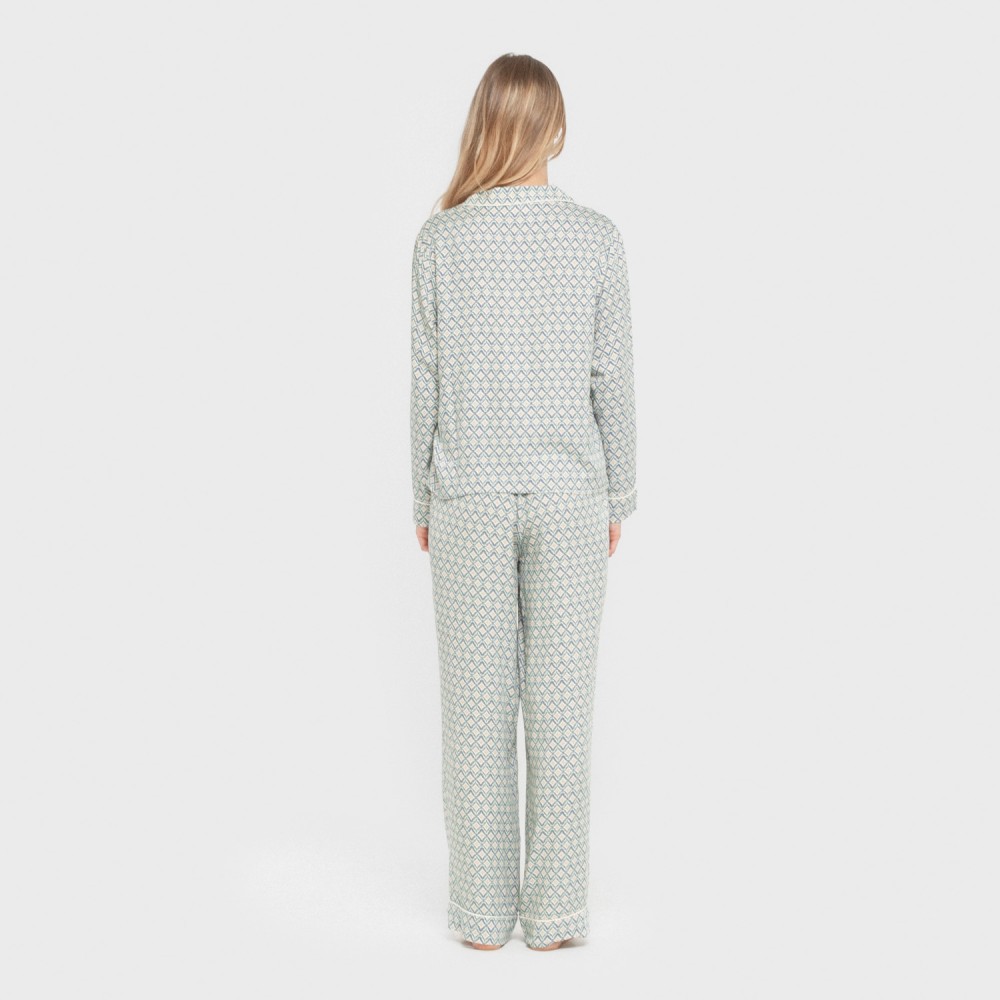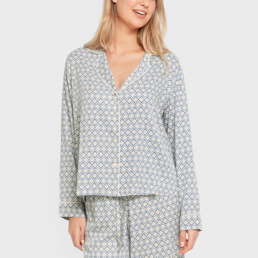 Include una camicia con bottoni e revers e un pantalone lungo fluido di colore bianco con stampa geometrica di colore blu e sabbia.