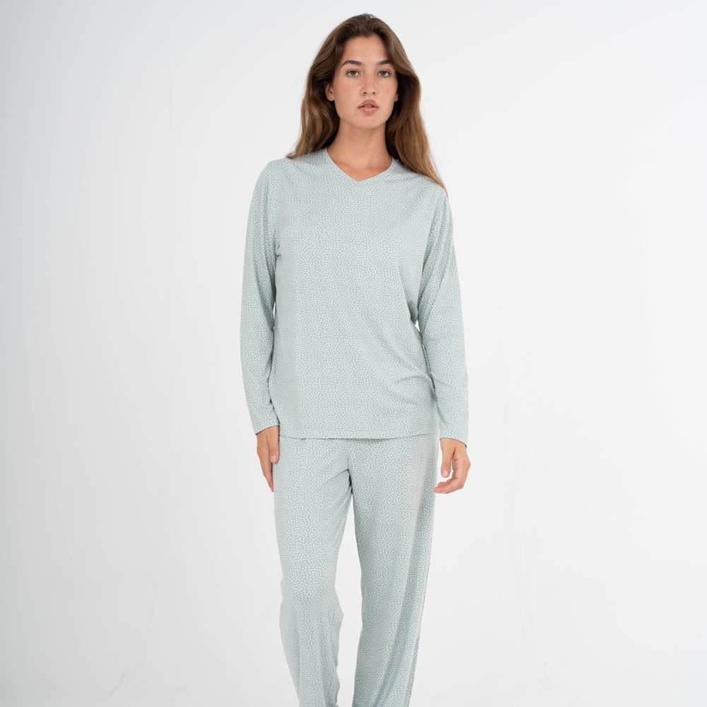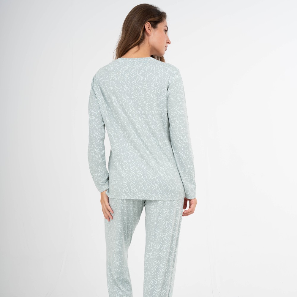 Pigiama da donna modello Lolenda verde Tiffany composto da maglia a maniche lunghe e pantalone lungo dal tocco morbido.