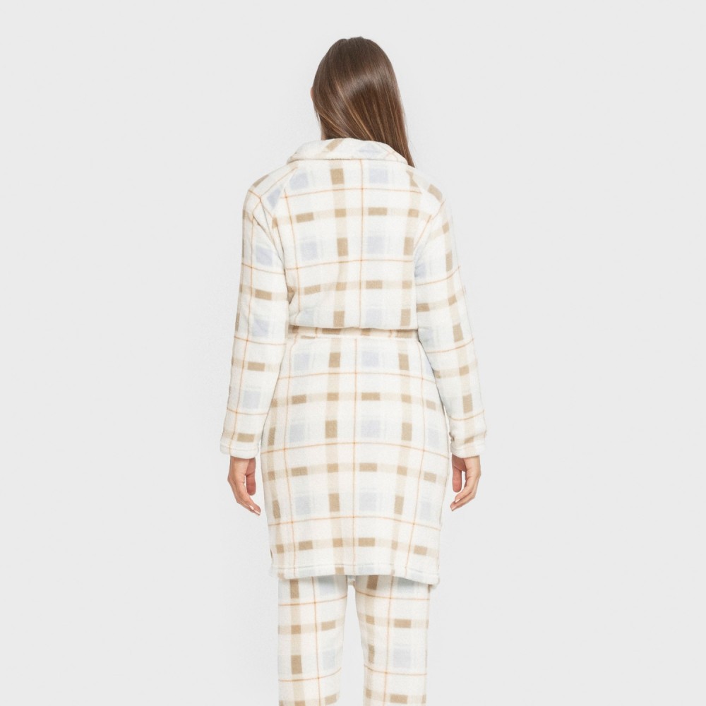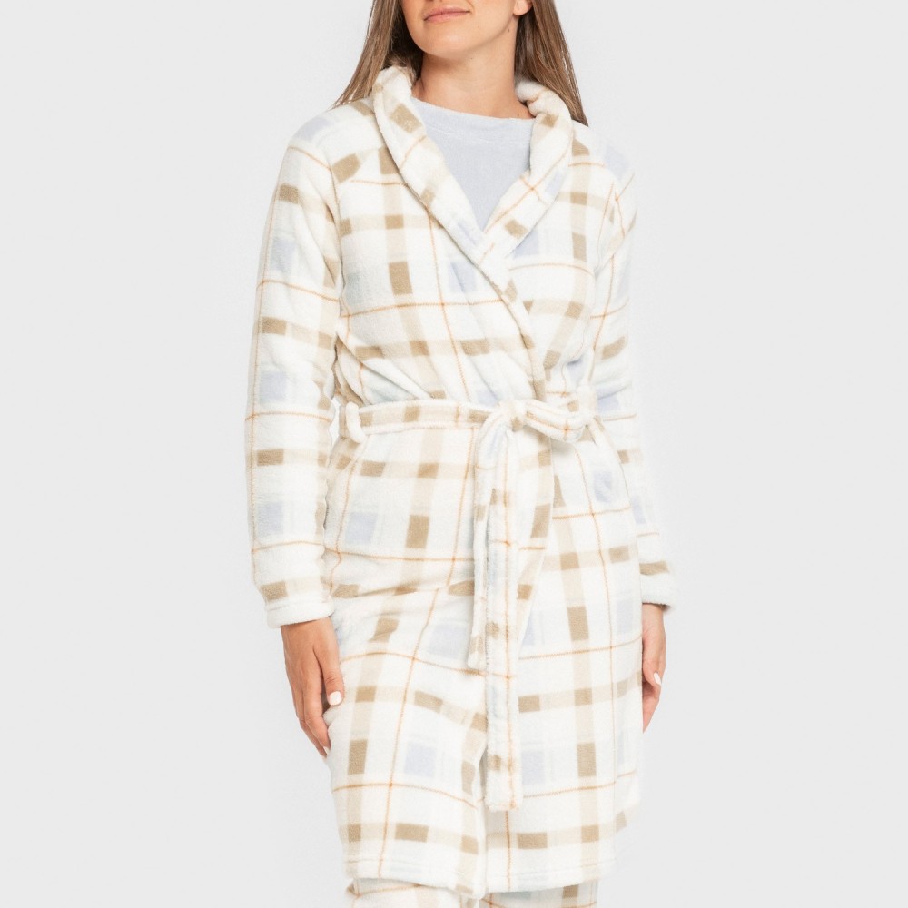 Vestaglia bianca con stampa a quadri azzurri e sabbia, realizzata in morbidissimo tessuto di coralina e regolabile con cintura.
